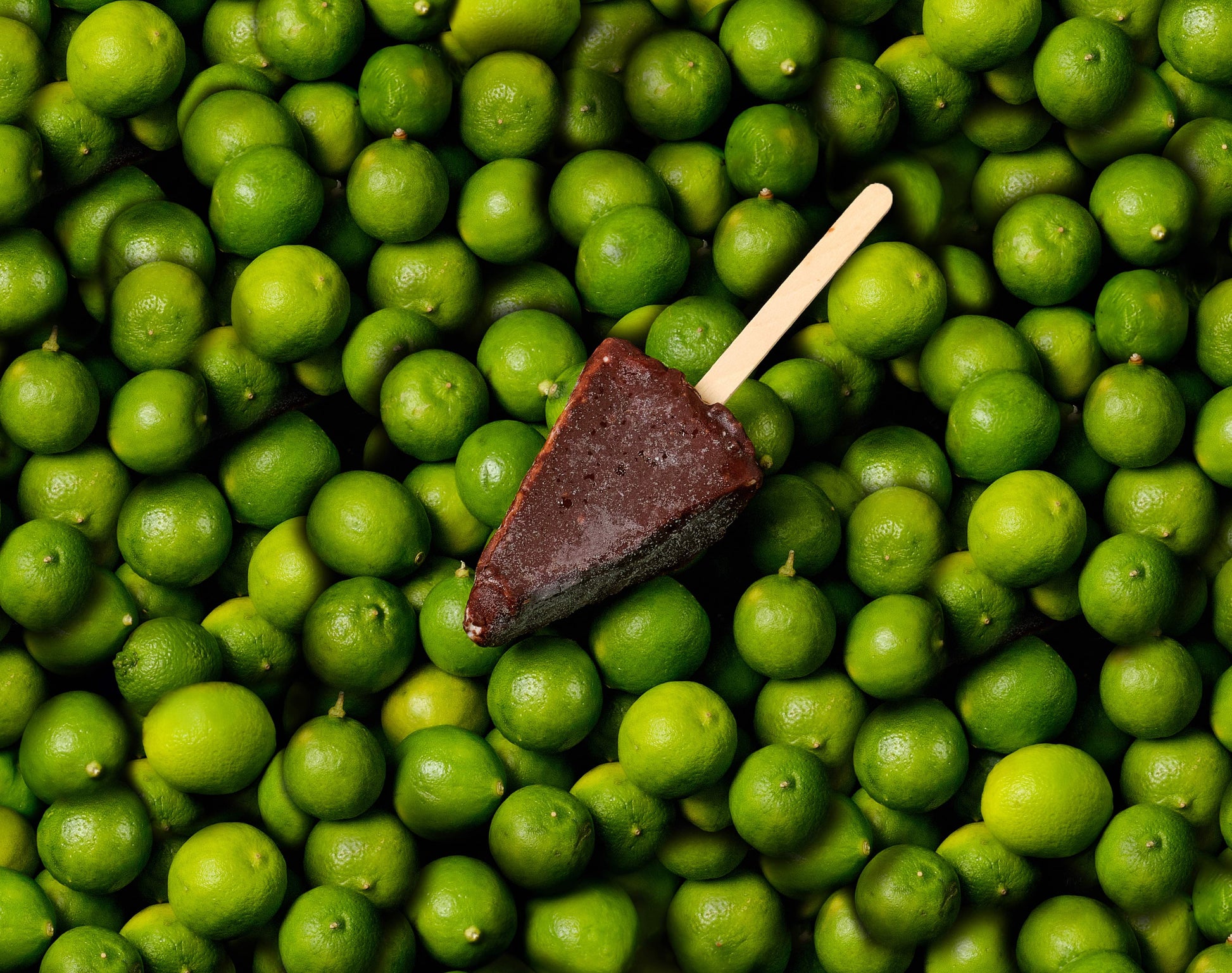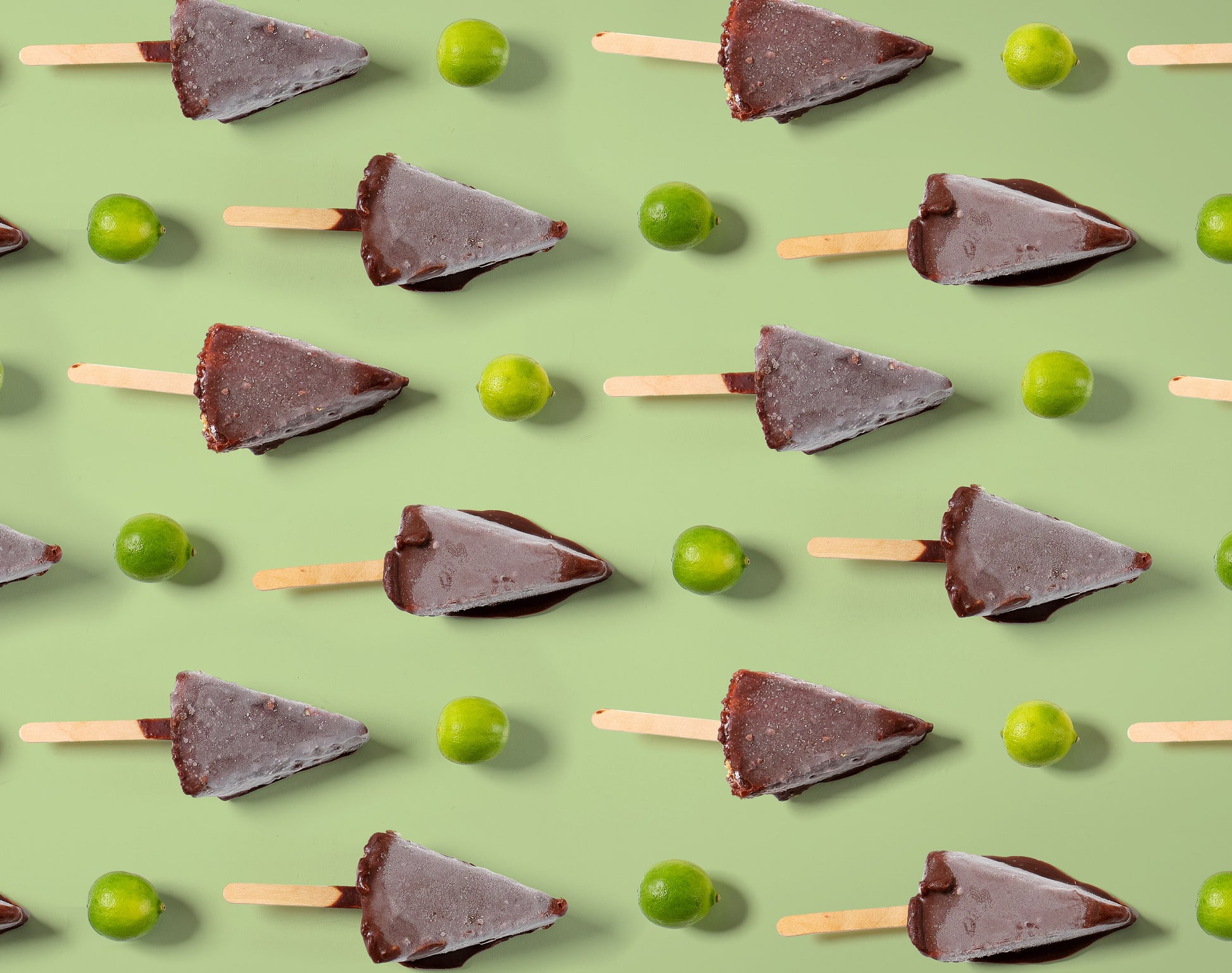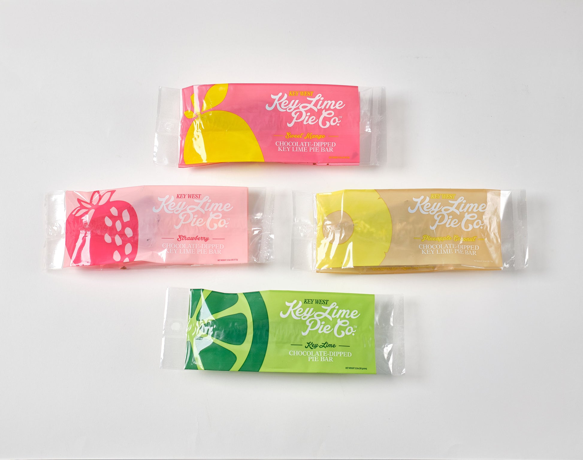 To make our pie bars, we take our key lime pies, cut into individual slices, insert a popsicle stick, and then dip into rich, delicious chocolate.